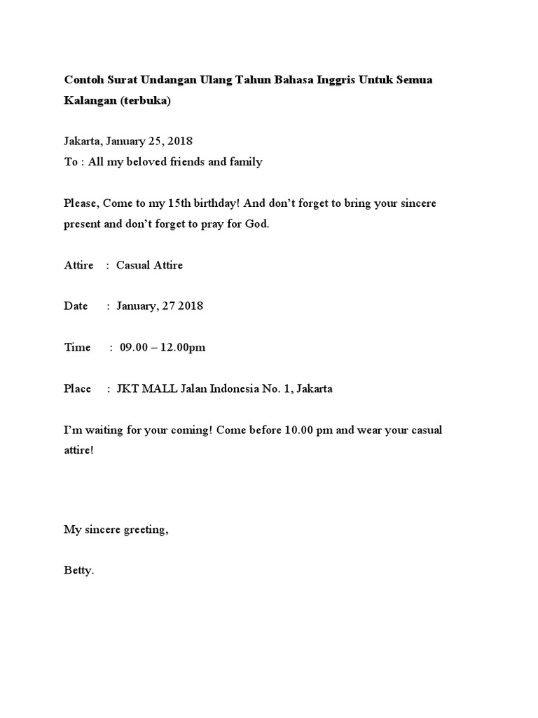Contoh surat resmi dalam bahasa inggris beserta bagiannya bahasa. My sincere greeting, your friend. Dan jangan lupa bawa kado. Ratna rio, can you please pickaunt jena, my friend, in thestation. Teks contoh surat undangan ulang tahun dalam bahasa inggris. Joana berusia enam belas tahun dan sekarang adalah waktu untuk merayakan pesta ulang tahun yang akan dirayakan pada sabtu malam depan, di jalan gold. Contoh surat undangan resmi dapat digunakan agar surat undangan yang kamu buat sesuai dengan berikut kami berikan contoh surat undangan resmi yang bisa dijadikan referensi dalam dalam membuat surat undagan resmi ada beberapa hal yang perlu diperhaitikan terkaitan komponen. Contoh surat undangan reuni dalam bahasa inggris. Contoh surat undangan acara ulang tahun. Untuk lebih jelasnya mengenai undangan rapat, berikut ini adalah beberapa contoh undangan rapat dalam bahasa inggris Hari ulang tahun merupakan momen yang sangat berharga bagi setiap orang. Hello everyone, meet again with us here in our beloved website! Hanny nah itulah dia beberapa contoh surat undangan dalam bahasa inggris yang bisa menjadi referensi bagi kalian.