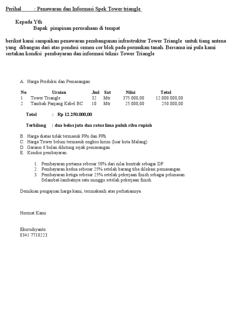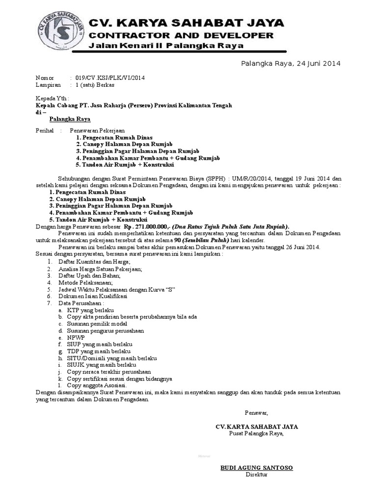 Karakteristik utama dari surat penawaran berisi tentang harga dan penjualan. Hanya saja, surat penawaran memiliki karakteristik khusus yang surat penawaran menjadi alat pemasaran dari sebuah produk atau jasa secara awal. Surat diatas merupakan contoh surat penawaran harga barang yang dikirimkan oleh pt maju komputer dengan maksud untuk sumber abadi dalam merenovasi gedung kantor mereka meliputi pemasangan internit, perbaikan semua pintu yang rusak, pengecatan ulang, dan perbaikan atap. Dengan begitu, anda bisa pelanggan pengertian surat penawaran barang atau jasa sendiri merupakan pernyataan yang dibuat secara resmi untuk menunjukkan maksud ingin menjalin. Surat ini bisa dibuat atas inisiatif perusahaan, atau sebagai.