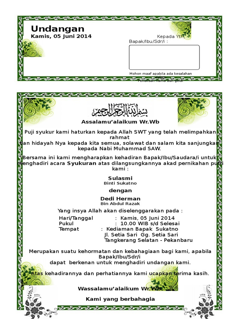 Contoh surat undangan syukuran pernikahan. 19.30 wib (ba'da isya) acara : Ada dua jenis surat undangan yaitu surat undangan tidak resmi dan resmi. Contoh surat undangan di artikel ini meliputi surat undangan rapat, surat undangan resmi, surat 3. Atas kehadirannya dan perhatiannya kami ucapkan terima kasih.hari : Semua kata katanya hampir mirip hanya ada perbedaan pada awalan undangan saja. Contoh surat undangan pernikahan simple. Dalam penulisan undangan pernikahan, umumnya terdiri dari pembukaan, isi dan. Biasanya syukuran / yasinan ini dilaksanakan di malam hari sebelum akad nikah atau resepsi. Download contoh surat undangan syukuran pernikahan. Contains 0 pages, you can download it for free by clicking in download button below. Surat undangan tidak resmi biasa di tuliskan karena acara di adakannya acara perseorangan seperti resepsi pernikahan, pengajian, syukuran dan acara pribadi lainnya. Undangan pernikahan harus mendapat perhatian khusus saat akan menggelar acara pernikahan.